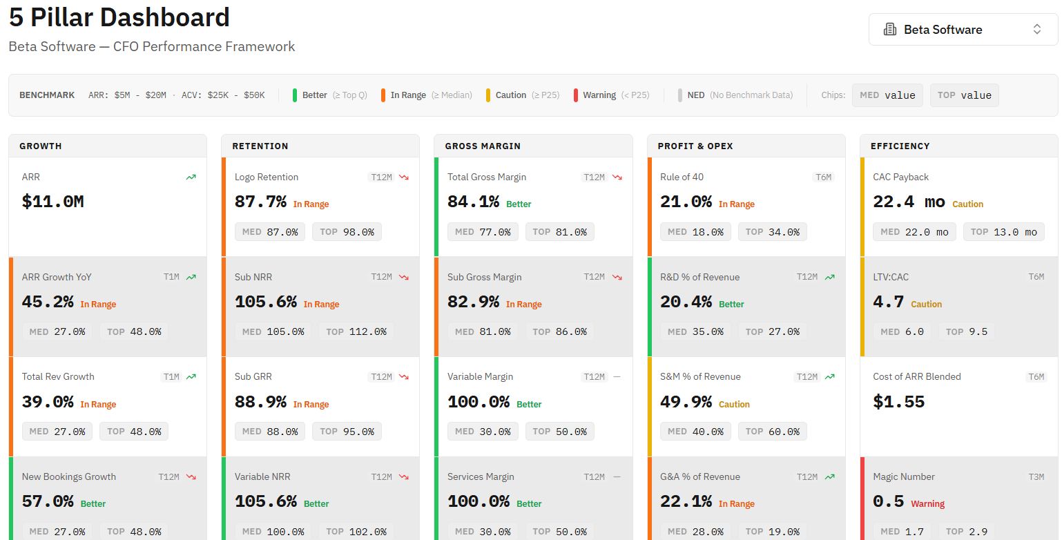 I’ve spent over 20 years working in software finance, including serving as an in-house SaaS CFO responsible for building metrics frameworks, financial models, and board reporting.